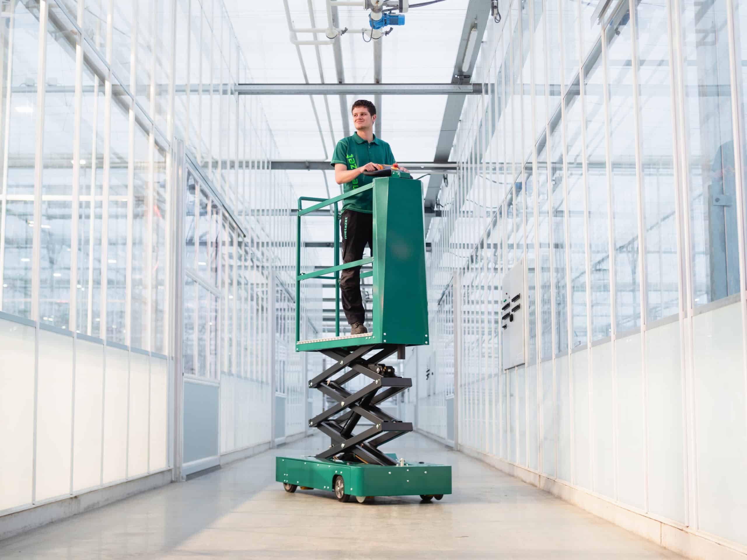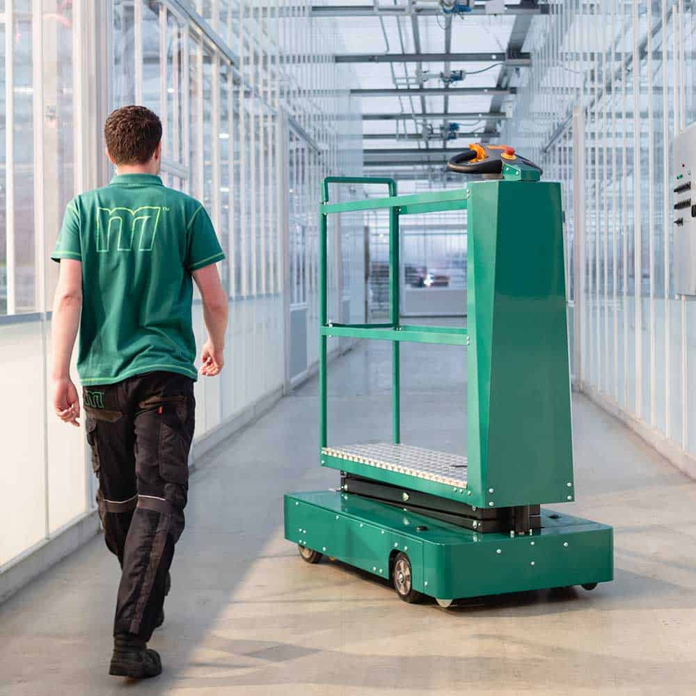 De M-Service 3500 combineert compacte wendbaarheid met een stabiel platform dat tot 3,5 meter hoogte reikt. De hydrauliek wordt aangestuurd via een motorcontroller, waardoor stijgen en dalen vloeiend en gecontroleerd verlopen. Dankzij de geïntegreerde rijtechniek kan eenvoudig van betonpad naar buisrail worden gereden zónder af te stappen. Het smalle scharendesign beschermt de gewassen tegen beschadiging en met de lithiumbatterij werkt de wagen moeiteloos een volledige dag door.”