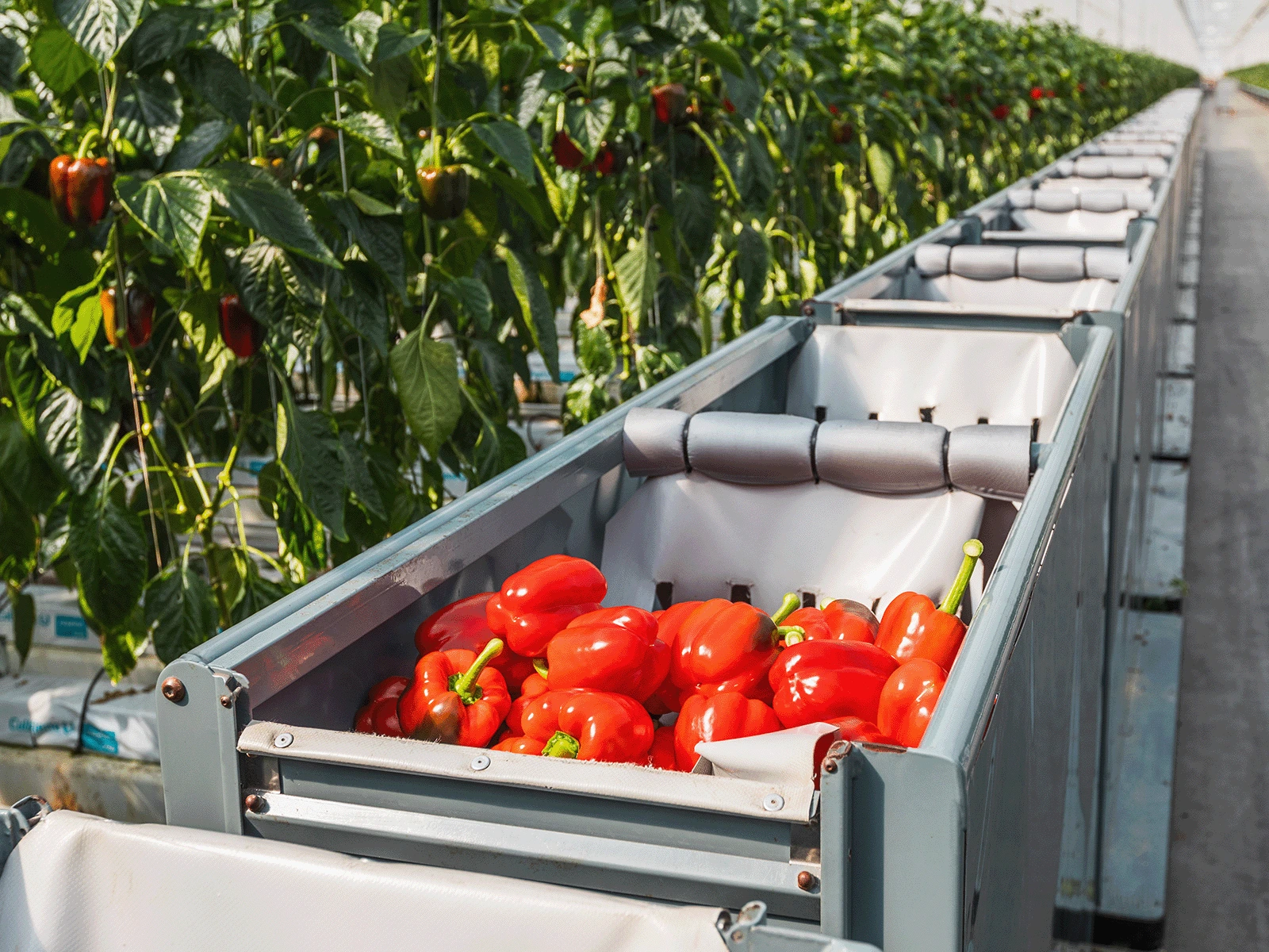 De bulkwagen is een elektrisch aangedreven transportwagen, speciaal gebouwd voor de paprika-oogst in bulk