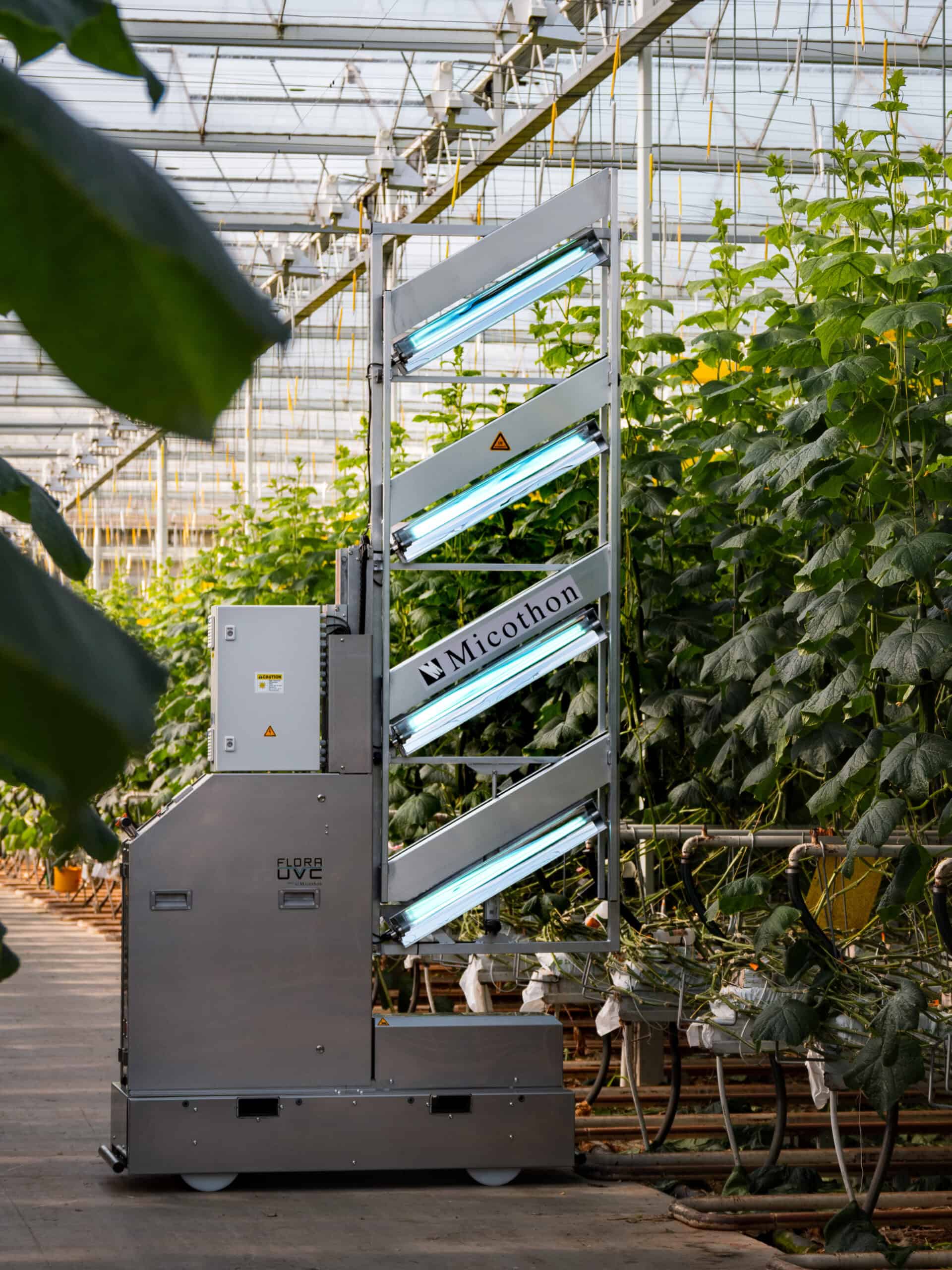 Dit autonome platform rijdt zelfstandig over het bestaande buisrailsysteem en behandelt het gewas met gecontroleerde doses UV-C-licht. De korte golflengte doodt schimmelsporen op het bladoppervlak zonder het gewas te beschadigen, een milieuvriendelijk alternatief voor chemische middelen.